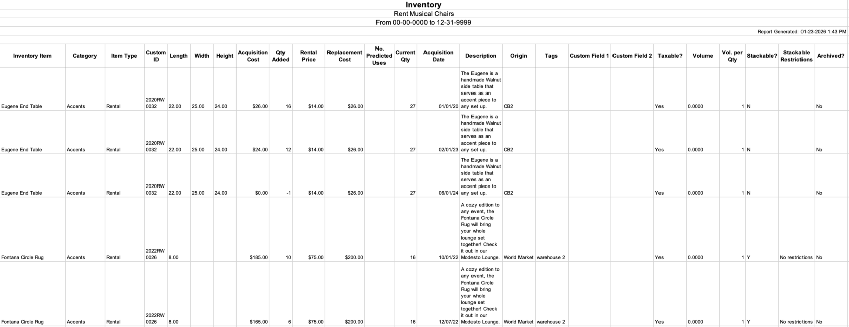 Select a prefixed date range or enter a specific date range you’d like the report to reflect. Keep in mind, the date range selected will reflect all the Items added to your Account through Quantity Change Events within that time frame.