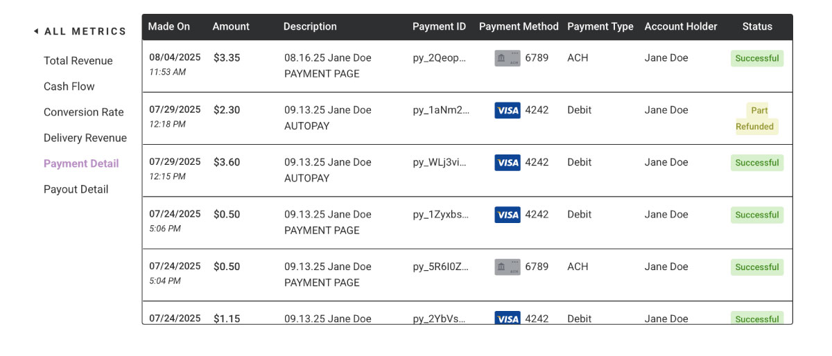 - Status: Successful, Failed, Refunded, or Part Refunded