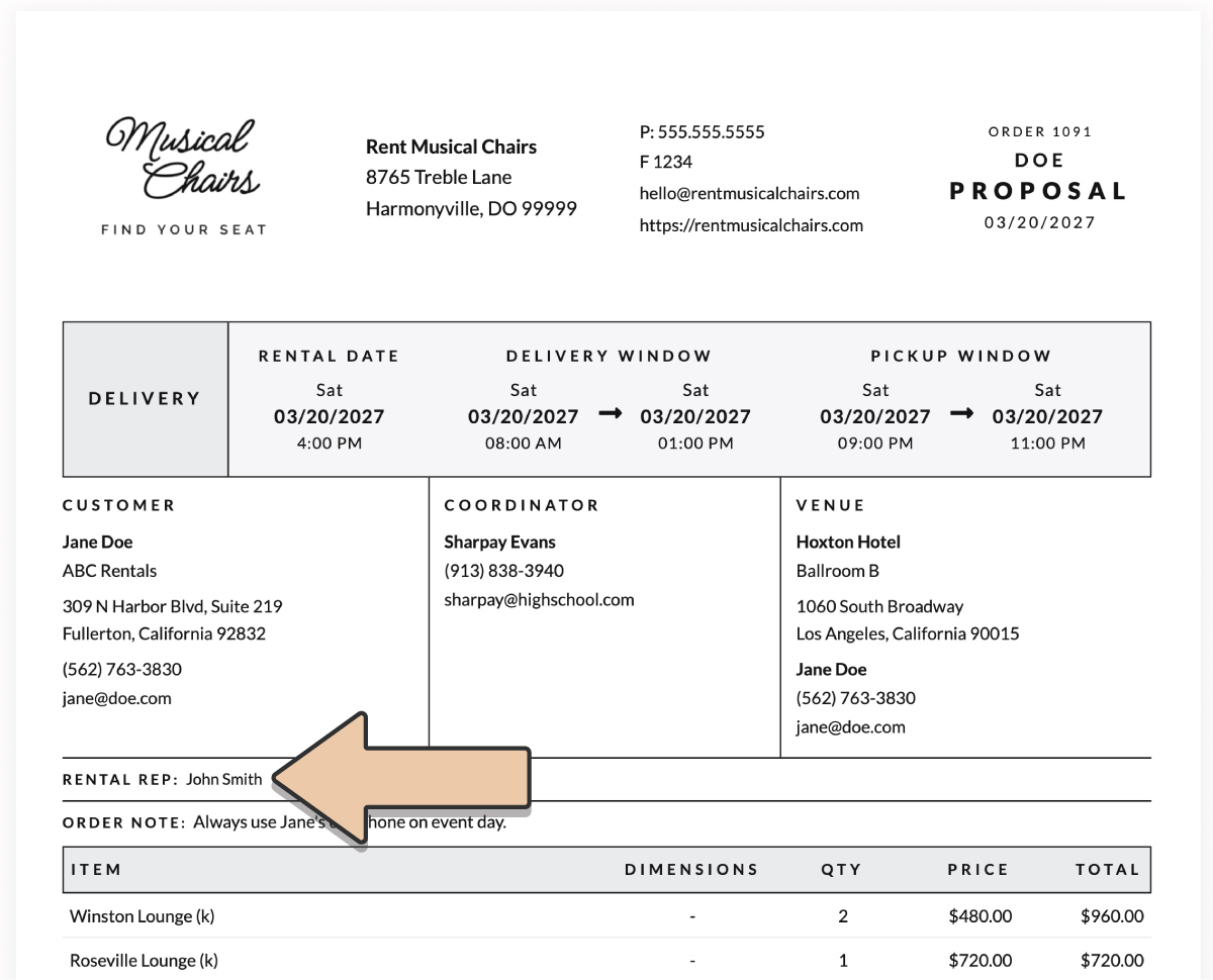 The Rental Rep will display the assigned User’s First and Last Name above the Order Note on PDFs.